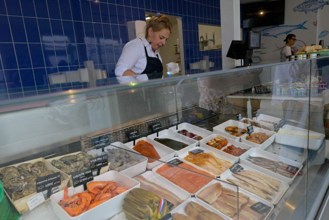 Groot, proper en een zeer uitgebreide keuze. Het zijn de eerste zaken die ons opvallen. De donkerblauwe tegels en grote tekeningen van zeebewoners op de muren geven de sfeer van een échte ‘poissonnerie’ aan de Belgische kust. Al komt de aanvoer voor Mick ’n Fish hoofdzakelijk uit de Nederlandse wateren.