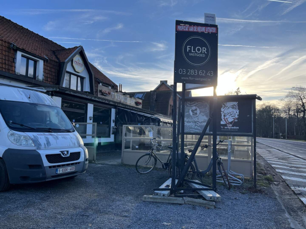 Het verkoopsbord van Flor Vastgoed met ‘proficiat voor de nieuwe uitbater’ van vorig jaar staat nog voor de zaak. Aan de verandatent hangt een uitgeprinte mail die de aanvraag van het faillissement vermeldt.
