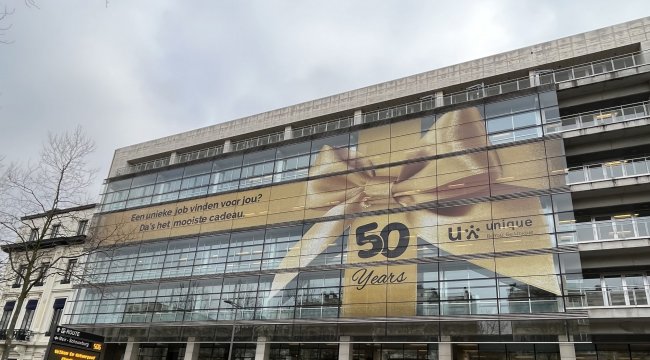 Unique viert dit jaar haar 50ste verjaardag. De HR-dienstverlener van Nederlandse bodem viert dat gouden jubileum op verschillende manieren. Ook het Belgische hoofdkwartier in Antwerpen ontsnapt niet aan de festiviteiten: het gebouw werd omhuld door een levensgrote banner.