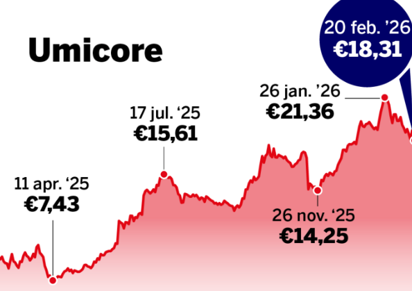 Opmerkelijk is ook dat het bedrijf aan een eerherstel bezig is op de beurs. In de zomer van 2024 verscheen in deze krant nog een stuk over de drastische val Umicore op de beurs. De koers was toen in drie jaar tijd gedaald van 56 naar 11 euro. Vandaag ziet de situatie er anders uit: een jaar geleden was een aandeel van Umicore 9 euro waard, nu betaal je 18 euro. Is de gevallen goudhaan aan een nieuwe lange en trotse kraai begonnen? En is dit aandeel dus een goede belegging voor wie in de toekomst van elektrisch rijden gelooft? “Het bedrijf is er vandaag in elk geval beter aan toe dan twee jaar geleden, omdat het nieuwe management de juiste ingrepen heeft gedaan”, zegt Paul D’Hoore, bekend van VTM Nieuws en hoofdredacteur van het beleggingsblad Beurssucces.