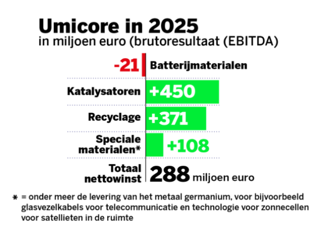 Umicore doet in hoofdzaak drie zaken. Het haalt in Hoboken edelmetalen zoals goud, zilver, koper, lood en nikkel uit gsm’s, toetsenborden en industrieel afval, het maakt katalysatoren die de uitstoot verminderen van voertuigen die op diesel en benzine rijden, en het maakt kathodepoeder voor batterijmaterialen van elektrische voertuigen. Vrijdag kondigde de groep vrij goede resultaten aan. Het zag zijn omzet stijgen tot 3,6 miljard euro en heeft in 2025 een nettowinst van 288 miljoen euro gemaakt. Dat is meer dan de 255 miljoen euro van 2024.