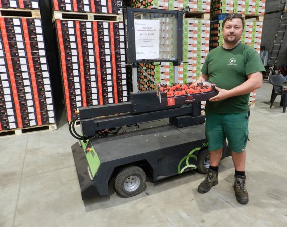 “De eerste versie van het apparaat maakte gebruik van een elektriciteitskabel. De robot bij ons wordt gevoed door een batterij, wat veel praktischer is. Het systeem werkt volledig met cameradetectie. Die is ingesteld om de rijen van de aardbeien te volgen. Voor de veiligheid staan er een zwaailamp, een noodstop en zelfs richtingaanwijzers op. Aan beide zijden zijn stootkussens aangebracht.”