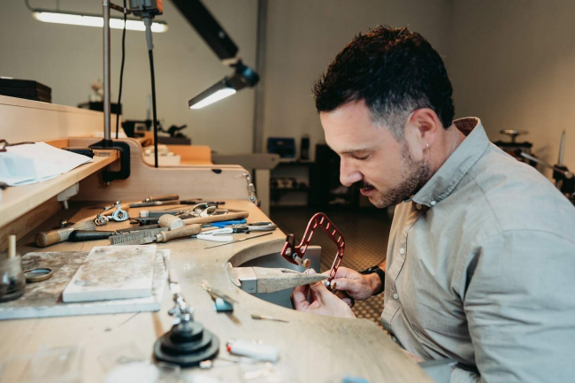 De specialiteit van Arvid zijn juwelen op maat. “Ik doe geen seriewerk, elke creatie is een uniek stuk en handgemaakt. Dat is het verschil met een juwelier die een mal maakt en zo twintig keer hetzelfde stuk maakt, of aangekochte juwelen in de etalage heeft liggen. Bij mij ontstaat een creatie na een gesprek met de klant. Naast goud werk ik ook graag met kleurstenen. Als een creatie af is, geef ik het een podium op Instagram.”