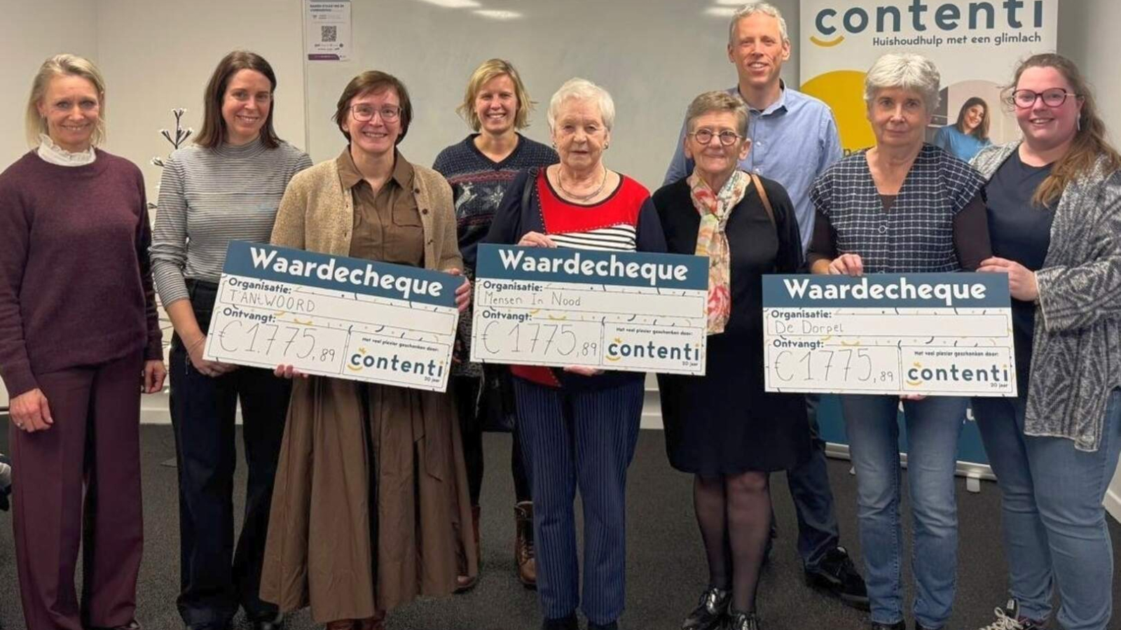 Het bedrag werd gelijk verdeeld over ’t Antwoord (Turnhout), Mensen In Nood (MIN) Geel en De Dorpel (Herentals). Dat is de fraaie opbrengst van de warme eindejaarsactie waarbij Contenti bamboedoeken verkocht. “Dat is duurzaam, kwalitatief poetsmateriaal waar onze huishoudhulpen heel graag mee werken”, zegt verantwoordelijke Jasper Somers van Contenti. “Klanten die een pakket kochten, steunen niet alleen het goede doel, maar investeren tegelijk in gezond en ecologisch materiaal voor hun huishoudhulp.”