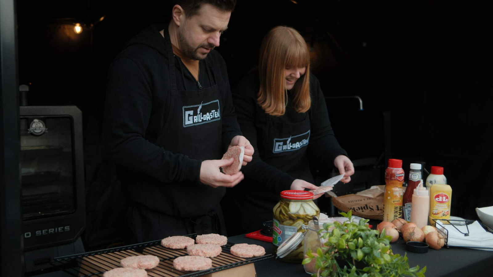 Chique hamburgers zijn de specialiteit van de Grillgasten. “Onze hamburgers worden traag gegaard in pelletsmokers, waardoor je een typische en fijne rooksmaak krijgt, en daarna afgebakken op de plancha (ijzeren bakplaat, red.) met aandacht voor smaak, kwaliteit en beleving”, zegt grillmaster Hans. “Onze hamburgers zijn van puur rundvlees, maar we hebben ook veggieburgers, afgewerkt met groenten en toppings naar wens: van sla tot tomaten, augurk, spek, ei, gebakken ajuin en sauzen.”