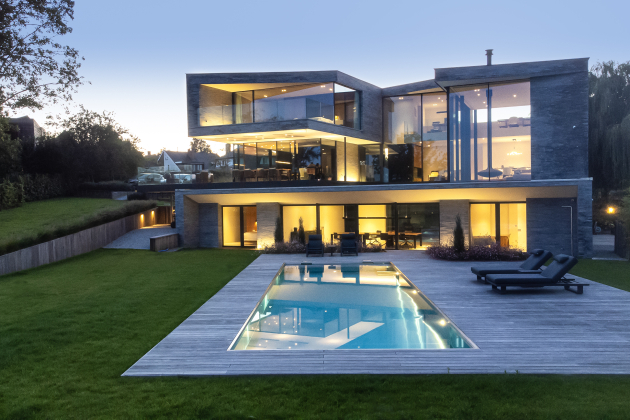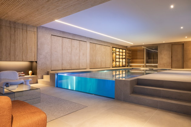 Het bekroonde binnenzwembad in Damme vormt het hart van een exclusieve wellnessruimte met sauna, hammam en een zithoek aan de open haard. Een opvallend element is de transparante acrylwand, die de natuurlijke niveauverschillen benadrukt en een unieke doorkijk creëert tussen zwembad en tuin.